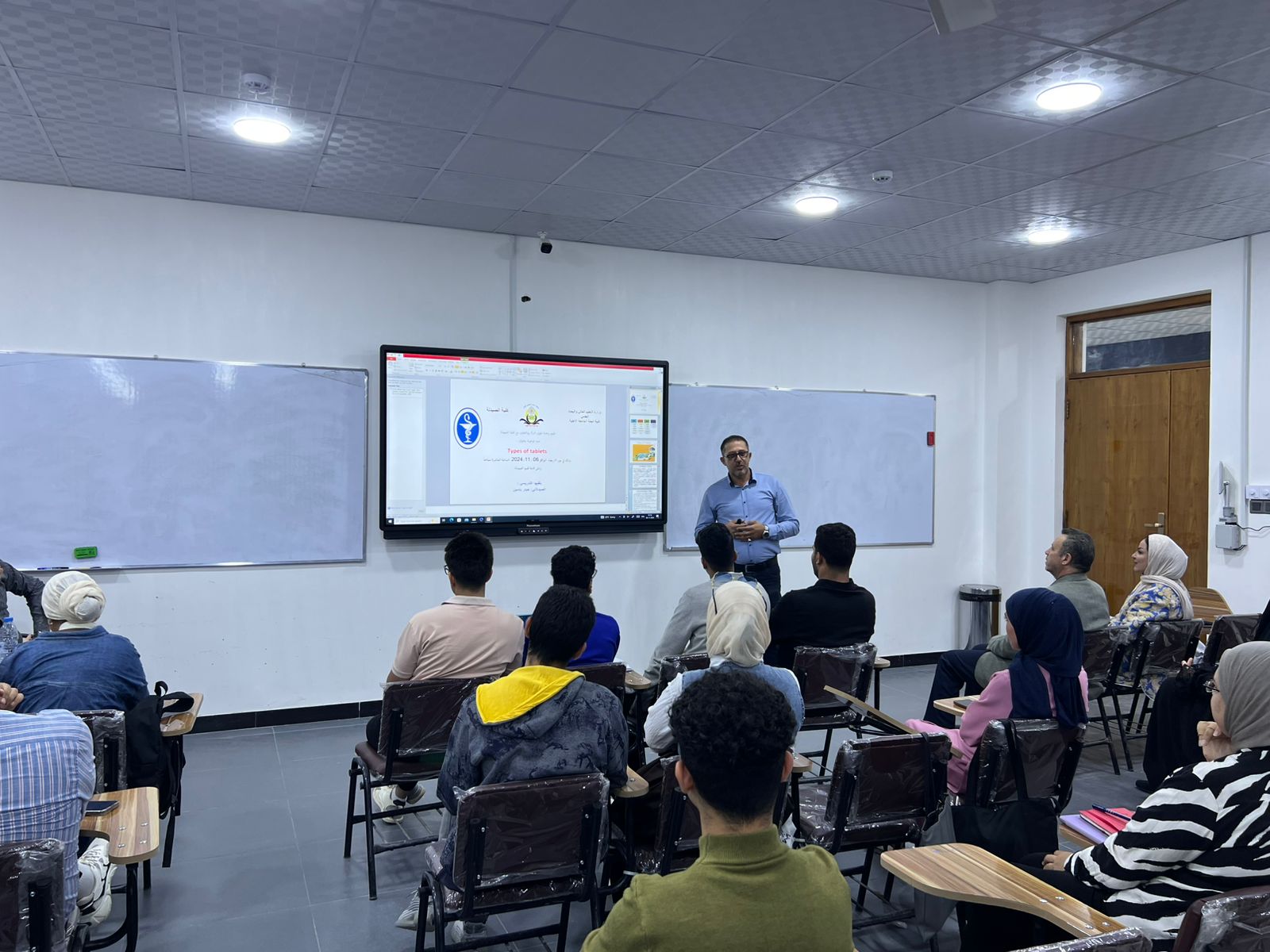As part of the activities of the Continuing Education Unit at the College of Pharmacy, and in cooperation with the Women’s Affairs Unit at Hilla University, the College of Pharmacy held a scientific symposium entitled “Types of Therapeutic Tablets,” delivered by Pharmacist Haider Yassin, a lecturer at the College of Pharmacy.